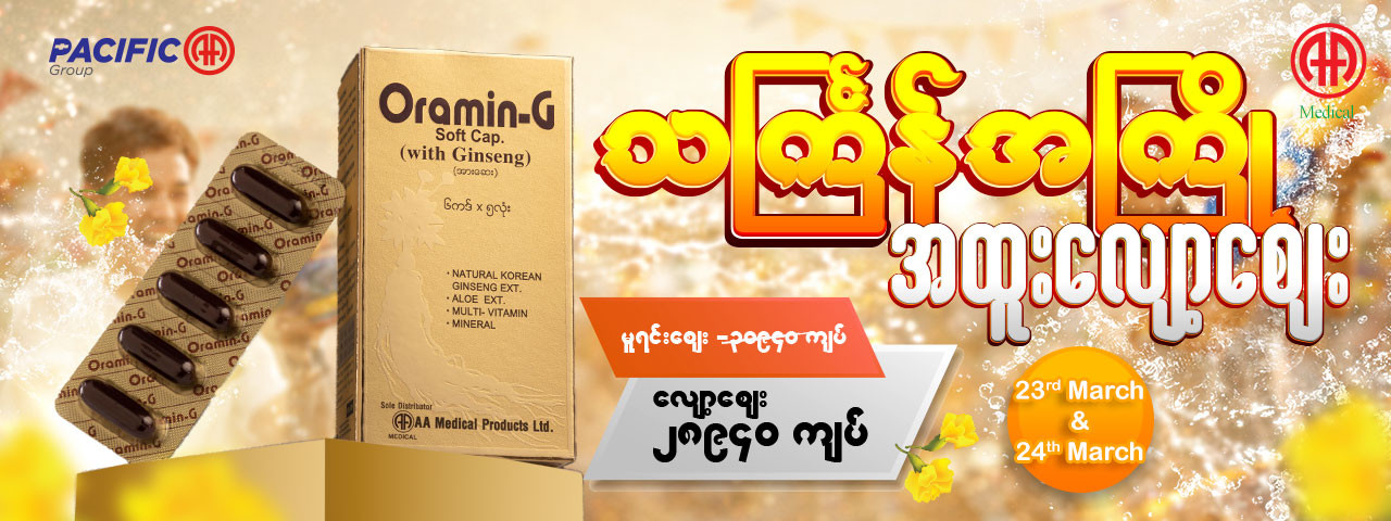Oramin-G ရဲ့ သင်္ကြန်အကြို အွန်လိုင်းပရိုမိုးရှင်းအဖြစ်.. 👉 ၂၃.၃.၂၀၂၆ မှ ၂၄.၃.၂၀၂၆ အထိ ✦ Oramin-G (၁) ဘူးဝယ်ယူတိုင်း ▸၂၈၉၄၀ ကျပ် (၂၀၀၀ ကျပ် လျှော့ဈေး) ဖြင့် ဝယ်ယူရရှိနိုင်မှာဖြစ်ပါတယ်။ ⠀⠀⠀⠀⠀⠀⠀⠀⠀⠀⠀⠀