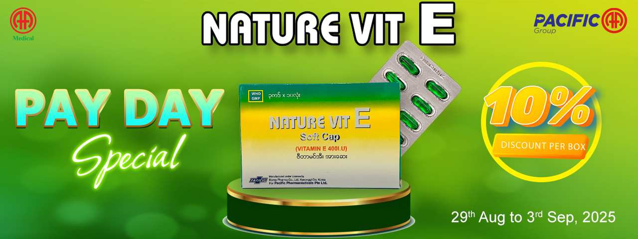 အသေးစိတ်ကြည့်ရှုရန်Nature Vit E အလုံး (၃၀)ပါ တစ်လစာ တစ်ဘူးကို 10% Discount from 29th Aug to 3rd Sep