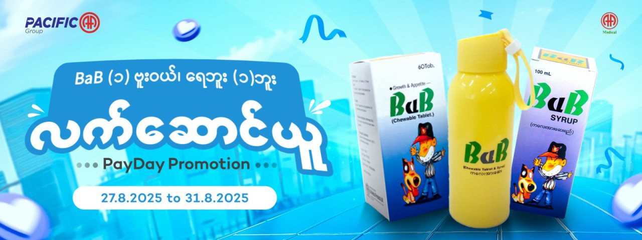အသေးစိတ်ကြည့်ရှုရန်Aug 27 ကနေ Aug 31 ရက်နေ့အထိ BaB ကို Online ကတဆင့် ဝယ်ယူမယ်ဆိုရင် တစ်ဗူးဝယ်တာနဲ့ BaB ရေဘူး (၁) ဘူးလက်ဆောင်